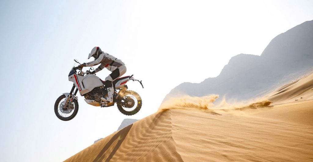 La DesertX está equipada con la última evolución del Testastretta 11th desmo de 937 cc, más ligero en 1,7 kg en comparación con la generación anterior y equipado con una nueva relación de transmisión para garantizar el mejor comportamiento off-road.