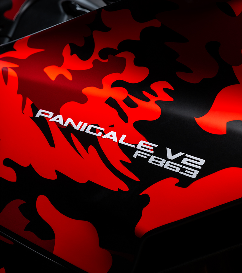 La Panigale V2 FB63 es un homenaje directo a Francesco Bagnaia y a la motocicleta que utiliza en sus entrenamientos durante la temporada de MotoGP. Su diseño destaca por una gráfica camouflage inspirada en el casco, las botas y los guantes de competición del tricampeón del mundo, reflejando su carácter, estilo y ADN racing.