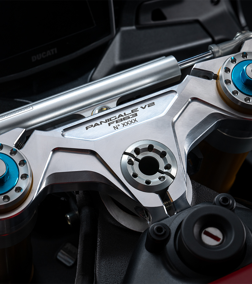La tija superior, fabricada en aluminio mecanizado a partir de un bloque sólido, está personalizada con el nombre del modelo y el número de serie progresivo, subrayando la exclusividad de cada unidad. Además, incorpora un amortiguador de dirección Öhlins de alto rendimiento, que ofrece mayor estabilidad y precisión en el manejo, incluso en sesiones de conducción deportiva exigente en pista.