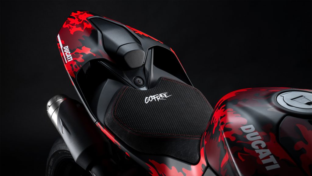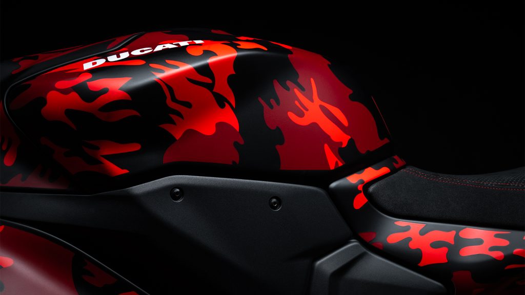 Esta edición especial de la Panigale V2 nace directamente de la experiencia en pista de Francesco Bagnaia, ya que es el modelo que utiliza habitualmente en sus entrenamientos. Por eso incorpora un equipamiento pensado para quienes buscan el máximo desempeño en circuito: semimanillares más bajos, rines forjados y detalles inspirados en el mundo de las carreras que hacen a la Panigale V2 aún más precisa, ágil y efectiva entre los pianos. Su exclusiva decoración camouflage en negro y rojo está inspirada en el casco y los guantes de competición de Bagnaia, reforzando su ADN racing.